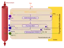 The Wolff–Chaikoff effect is known as an autoregulatory phenomenon that inhibits organification in the thyroid gland, the formation of thyroid hormones inside the thyroid follicle, and the release of thyroid hormones into the bloodstream.[6] This becomes evident secondary to elevated levels of circulating iodide. The Wolff–Chaikoff effect is an effective means of rejecting a large quantity of imbibed iodide, and therefore preventing the thyroid from synthesizing large quantities of thyroid hormone.[7] Excess iodide transiently inhibits thyroid iodide organification. In individuals with a normal thyroid, the gland eventually escapes from this inhibitory effect and iodide organification resumes; however, in patients with underlying autoimmune thyroid disease, the suppressive action of high iodide may persist.[8] The Wolff–Chaikoff effect lasts several days (around 10 days), after which it is followed by an "escape phenomenon,"[9] which is described by resumption of normal organification of iodine and normal thyroid peroxidase function. "Escape phenomenon" is believed to occur because of decreased inorganic iodine concentration inside the thyroid follicle below a critical threshold secondary to down-regulation of sodium-iodide symporter (NIS) on the basolateral membrane of the thyroid follicular cell.