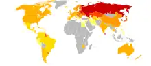 In western countries men are about 300% or thrice as likely to die by suicide than females, while a few countries (counting over a hundred million residents overall) exceed the 600% figure. Most considerable difference in male–female suicide ratios is noted in countries of the former Soviet Bloc and in some of Latin America.[64][17]