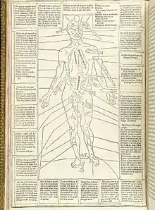 The Wound Man is a surgical diagram which first appeared in European medical manuscripts of the fourteenth and fifteenth centuries.[1] The illustration acted as an annotated table of contents to guide the reader through various injuries and diseases whose related cures could be found on the text's nearby pages. The image first appeared in a printed book in 1491 when it was included in the Venetian Fasciculus medicinae, likely Europe's first printed medical miscellany. Thereafter it circulated widely in printed books until well into the seventeenth century.[2] The Wound Man has since become a recognisable figure in popular culture.