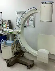 A system containing an image intensifier may be used either as a fixed piece of equipment in a dedicated screening room or as mobile equipment for use in an operating theatre. A mobile fluoroscopy unit generally consists of two units, the X-ray generator and image detector (II) on a moveable C-arm, and a separate workstation unit used to store and manipulate the images.[13] The patient is positioned between the two arms, typically on a radiolucent bed. Fixed systems may have a c-arm mounted to a ceiling gantry, with a separate control area. Most systems arranged as c-arms can have the image intensifier positioned above or below the patient (with the X-ray tube below or above respectively), although some static in room systems may have fixed orientations.[14] From a radiation protection standpoint, under-couch (X-ray tube) operation is preferable as it reduces the amount of scattered radiation on operators and workers.[15][16] Smaller "mini" mobile c-arms are also available, primarily used to image extremities, for example for minor hand surgery.[17]