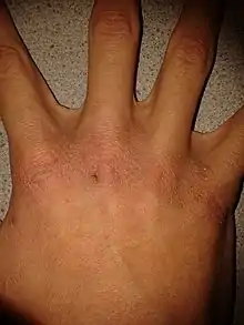 Xeroderma is a very common condition. It happens more often in the winter when the cold air outside and the hot air inside create a low relative humidity. This causes the skin to lose moisture and it may crack and peel. Bathing or hand washing too frequently, especially if one is using harsh soaps, can contribute to xeroderma. Xeroderma can be caused by a deficiency of vitamin A, vitamin D, zinc, systemic illness, severe sunburn, or some medication.[2] Xeroderma can be caused by choline inhibitors. Detergents such as washing powder and dishwashing liquid can cause xeroderma.[3]
