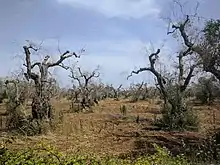 The cycle in olives has been called olive quick decline syndrome (in Italian: complesso del disseccamento rapido dell'olivo).[49][51] The disease causes withering and desiccation of terminal shoots, distributed randomly at first but then expanding to the rest of the canopy[51] resulting in the collapse and death of trees.[51] In affected groves, all plants normally show symptoms.[51] The most severely affected olives are the century-old trees of local cultivars Cellina di Nardò and Ogliarola salentina.[52]