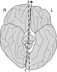 Yakovlevian torque (also known as occipital bending (OB)[1] or counterclockwise brain torque[2]) is the tendency of the right side of the human brain to be warped slightly forward relative to the left and the left side of the human brain to be warped slightly backward relative to the right. This is responsible for certain asymmetries, such as how the lateral sulcus of the human brain is often longer and less curved on the left side of the brain relative to the right. Stated in another way, Yakovlevian torque can be defined by the existence of right-frontal and left-occipital petalias, which are protrusions of the surface of one hemisphere relative to the other. It is named for Paul Ivan Yakovlev (1894–1983), a Russian-American neuroanatomist from Harvard Medical School.[3][4]