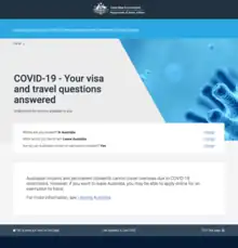 The first confirmed case in Australia was identified on 25 January 2020, in Victoria, when a man who had returned from Wuhan, Hubei Province, China, tested positive for the virus.[31] A human biosecurity emergency was declared on 18 March 2020. Australian borders were closed to all non-residents on 20 March,[32] and returning residents were required to spend two weeks in supervised quarantine hotels from 27 March.[33] Many individual states and territories also closed their borders to varying degrees, with some remaining closed until late 2020,[34] and continuing to periodically close during localised outbreaks.[35]