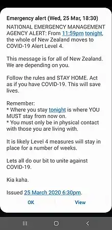 On 21 March, a four-tier alert level system was introduced, and most of the country was placed under lockdown from 25 March.[123] Due to the success of the elimination strategy, restrictions were progressively lifted between 28 April and 8 June, when the country moved to the lowest alert level, and the last restrictions (other than quarantine for travelers) were removed.[124][125][126][127][128]