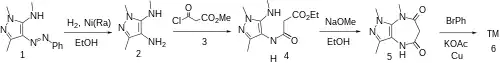 The catalytic hydrogenation of N,2,5-trimethyl-4-phenyldiazenylpyrazol-3-amine CID:136203602 (1) over Raney Nickel gives 4-amino-1,3-dimethyl-5-methylaminopyrazole, CID:10219477 (2). Treatment with methyl malonyl chloride [37517-81-0] (3) gives 4-a-ethoxycarbonylacetylamino-1,3-dimethyl-5-methylaminopyrazole, CID:20561101 (4). Base catalyzed lactamization gives (5). The Goldberg reaction completes the synthesis Zomebazam (6).