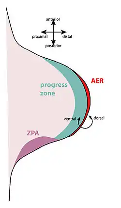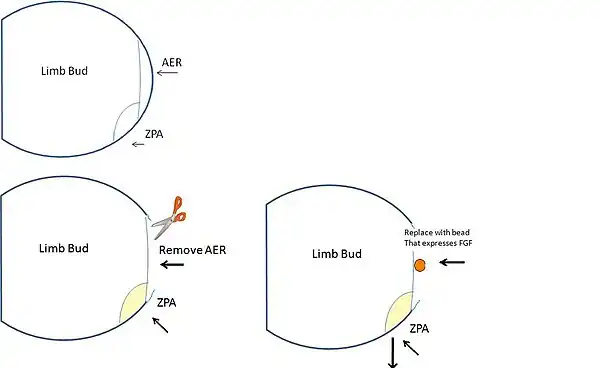 The zone of polarizing activity (ZPA) is an area of mesenchyme that contains signals which instruct the developing limb bud to form along the anterior/posterior axis. Limb bud is undifferentiated mesenchyme enclosed by an ectoderm covering. Eventually, the limb bud develops into bones, tendons, muscles and joints. Limb bud development relies not only on the ZPA, but also many different genes, signals, and a unique region of ectoderm called the apical ectodermal ridge (AER). Research by Saunders and Gasseling in 1948 identified the AER and its subsequent involvement in proximal distal outgrowth.[1] Twenty years later, the same group did transplantation studies in chick limb bud and identified the ZPA. It wasn't until 1993 that Todt and Fallon showed that the AER and ZPA are dependent on each other.[2]