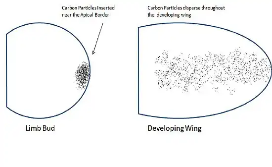 Saunders and Gasseling published data in the Journal of Experimental Biology in 1948, showing that reference marks inserted near the rim of the apical border of the wing bud are dispersed throughout the whole forearm of the wing.[1] This led them to believe that the apical ectoderm may play a role in forming parts of the wing. To test this, they removed apical ectoderm from wing buds which yielded deformed wings. When they removed dorsal ectoderm, normal wings formed. These results showed that the cells of the apical ectoderm have a precise fate to form specific regions of the wing.