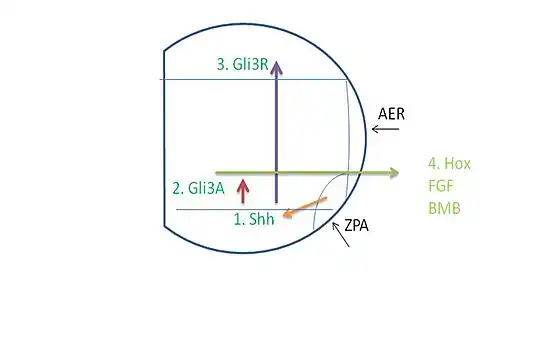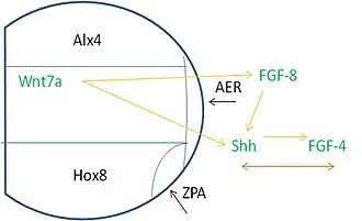 These regions are dependent on signaling in order for the appropriate induction events to occur. The AER expresses FGF8 which induces Shh expression in the posterior mesoderm. Shh then stimulates FGF4 to be expressed in the posterior part of the AER. After these events, there is a co-dependence between FGF-4 and Shh for their subsequent expression and maintenance. Additionally, Wnt7a is expressed in the dorsal ectoderm, is needed to maintain the FGF and Shh signaling.[3]
