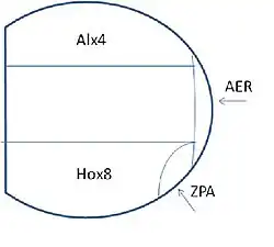 Patterning along the limb bud requires signals from many sources. Specifically, proteins called transcription factors (TF) help control the rate at which a gene is transcribed. The limb bud expresses a TF called ALX4 at the anterior part of the mesoderm, with the TF HOXB8 being expressed at the posterior portion. The Alx4 region, the medial region, and the Hox8 expressing area meet at a proximal area where the AER develops. The ZPA forms where the Hox8 region joins the AER.