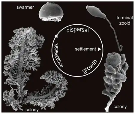 Most ciliates live as single-celled organisms in aquatic environments, and the single cell carries out all functions of life, such as nutrition, metabolism, and reproduction. Colonies of Z. niveum are composed of numerous individual cells that form a feather-like colonial unit, with several different cell types. Old branches of the colony illustrate the polymorphism of the zooids when viewed under the microscope. Three different forms of the individual ciliate cells are present, which are distinct in both form and function. The large macrozooids can transform into swarmers and leave the colony. They settle on suitable surfaces and develop into new colonies. The microzooids are small cells specialized for feeding, which the colony does by consumption of their symbiotic bacteria and other organic particles. At the terminal ends of the colony are specialized zooids that can elongate and facilitate the asexual reproduction of the colony.[2]