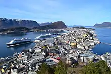 Ålesund is built on a row of islands extending towards the Atlantic. The compact old city centre is thus surrounded by water and Ålesund is one of Norway's major fisheries harbour (number 1 measured in revenue). To the east are the Sunnmøre Alps which offers a dramatic backdrop. Ålesund sits at the entrance to iconic Geirangerfjord, majestic Hjørundfjord as well as other great fjords in the Sunnmøre district.