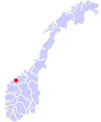 It is also on the E39 coastal main route between Bergen and Trondheim. This route requires taking quite a few ferries in either direction which makes it take as long to Trondheim as the ferry-less E136/E6 combo but more expensive.