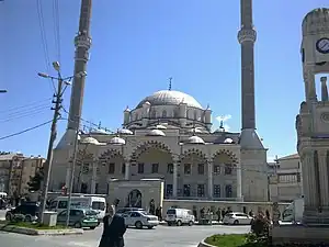 - The clocktower is in front of the mosque.