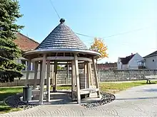 746). Built in baroque style, in 1734, during the great plague. Main facade deorated with arched niche and a damaged statues of the Holy Trinity. The square-shaped chapel is closed with arch apse. Wooden bell tower is decorated with graceful helmet. - 🌍 Calvary Chapel (Kálvária-kápolna) (Sugár út