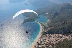 - Paragliding launches from the summit of nearby Mt Babadağ, about 1900 m above sea level. The parachute is already open on launch, and an experienced pilot can soar along the mountain updraughts for hours before landing on the beach. Beginners take a tandem-ride, strapped in front of an instructor, for a one hour flight - you need proper trainers, not flipflops or barefoot. Operators may pick up from hotels here and in Fethiye. They include Ölüdeniz Paragliding, Rota Fethiye, Sky Fethiye, Fly Infinity, Hanuman Travel and a dozen more.