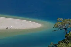 - 🌍 Blue Lagoon is the one in all the brochures - usually photographed from a parachute, since frankly it looks better from a distance. It's the "Ölü deniz" - dead sea - that gives the resort its name, for its flat calm waters, which in the right light are turquoise and ultramarine, but indeed dead if skies are overcast. The lagoon is a nature reserve, with public access 07:00-18:00 to the 1 km peninsula separating it from the open sea. They no longer charge a park admission fee, but expect to pay again and again for parking, beach entrance, beach chair, parasol, and very overpriced food and drink. The peninsula beach and underwater are gravel and rocks, so you need beach shoes. Since this is a nature reserve Turkish-style there's lots of strewn trash, and a cluster of hotels on the north shore. These have small artificial sand beaches but are reserved for their own guests.