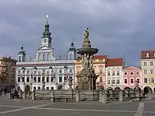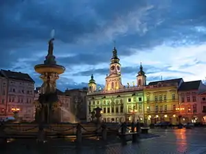 - 🌍 Přemysl Otakar II Square (Naměstí Přemysla Otakara II). The immense square in the middle of the town. Historical landmarks here include St. Nicholas Cathedral, the Black Tower, Samson's Fountain and the distinct yellow-colored Vcela Palace.