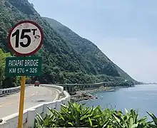 Section length: 104 km (65 mi). Paved road, becoming twisty at the edge of the Cordillera. Speed limits between 30–80 km (19–50 mi), except at Patapat Viaduct 15 km/h (9.3 mph). Route begins at 🌍 Laoag (km post 488).