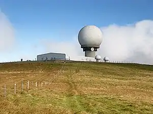 - π Lowther Hills Radar Station is the giant golfball perched on a tee two miles south of Wanlockhead, as if waiting for Wotan to thwack it. It's an automated primary air traffic control station monitoring aircraft within 120 miles. It was installed in Sept 2022 and uses anti-clutter technology to screen out radar interference by wind turbines. That makes it possible to build wind farms on the Lowther Hills, previously unsafe with the earlier station on the busy transatlantic route.