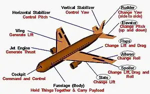 Lift generated depends on airspeed: the greater the speed, the greater the airflow over the wings and the greater the lift. Large commerical aircraft have two or more turbine engines each turning a propeller (a turboprop) or a large fan (a turbofan, commonly called a jet) to produce thrust and therefore airspeed. The engines combined with the elevators and horizontal stabiliser, which controls aircraft pitch (nose up/down), allows the pilot to control the aircraft's altitude and airspeed. If the pilot increases the engine power, the aircraft will climb; it the pilot decreases engine power, the aircraft will descend. If the pilot points the nose down without changing engine power, the aircraft will accelerate. Pilots can deploy flaps and slats to alter the shape of the wing, allowing the aircraft to generate more lift while flying at slower speeds, such as at takeoff and landing, at the expense of increased drag.