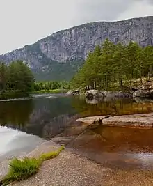 Setesdal is 150 km and cuts sharply into the bedrock with characteristic steep, polished cliffs rising abruptly from the relatively flat valley floor. Some 40 km of the valley floor is occupied by the Byglandsfjord-Åkrafjord lakes. These are two separate lakes that appear as one. They appear as fjords and are indeed called "fjord" according to local naming convention. The river often widens to what appears as lake.