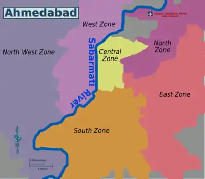 The classification below is according to Ahmedabad Municipal Corporation (AMC). The West Zone and New West Zone are on the west side of the Sabarmati River while all other zones are on the east side.