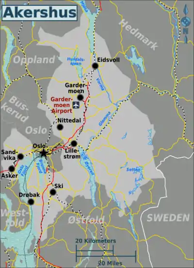 - 🌍 Oslo Airport (Gardermoen). Oslo Airport, Gardermoen is located in Akershus. It is a major international airport with flights from the USA and major European cities, as well as Asia. Direct trains to Oslo, Eidsvoll, Lillestrøm, Sandvika and Asker, and with a change to Ski. Airport coaches to Oslo and Ski.