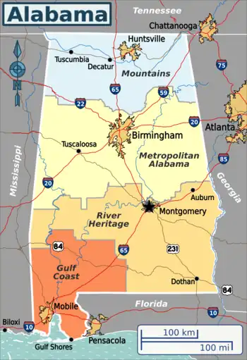 | Metropolitan Alabama central, most urbanized region of the state (Birmingham, Tuscaloosa) |