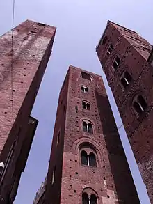 The town was probably established in pre-Roman times. The present historical centre is medieval but laid out in a grid originating from the Roman castrum (fortified military camp). Among its key buildings are the modest 6th century Baptistry, more striking are the many towers rising above the roofs.