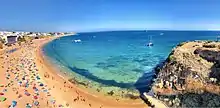 Albufeira is a city (cidade) and municipality (concelho) in the district of Faro (Algarve). Albufeira is one of the most popular and internationally famous holiday destinations in the Algarve, the most southern and sunniest region of continental Portugal. The resorts and hotels extend from Olhos d'Agua to Galé along the beautiful rocky coastline of the area. Many holiday makers return year after year because of the lovely beaches, very good climate, proximity of many restaurants, bars and pubs.