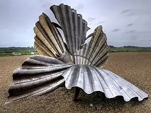 - 🌍 The Scallop, Thorpe Rd, IP16 4NR. A 2003 stainless-steel sculpture by Maggi Hambling commemorating Benjamin Britten, who lived in Aldeburgh from 1947 until his death in 1976. The 4-m-tall piece is made of two interlocking broken scallop shells. The main upright shell as cutouts reading "I hear those voices that will not be drowned", taken from Benjamin Britten's opera Peter Grimes. It is meant to be enjoyed both visually and tactilely, and people are encouraged to sit on it and watch the sea.