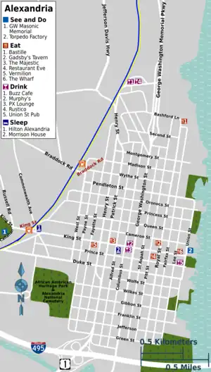 • 🌍 Carlyle House, 121 North Fairfax St, ☏ +1 703 549-2997. Former home to a successful local merchant, the house served as the headquarters of British Maj. Gen. Braddock before his ill-fated 1755 campaign in western Pennsylvania. The house also served as the site where several colonial governors met to discuss financing of the French and Indian War, and later, the state of affairs with the British Crown, leading to subsequent meetings at Annapolis, and Philadelphia, where the Declaration of Independence was drafted. Supposedly the only house in town that's not haunted because Carlyle had a cat entombed in a wall.