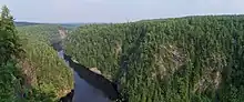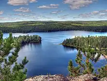 About 12% of the park’s land area is underwater. The park’s higher elevations are in the west half; the highest points are almost 600m above sea level, surrounding 🌍 Booth Lake and further west on the highlands around Porcupine Lake, 🌍 Mount Manitou. The lowest is 150m, on the Barron River near the east edge of the park.