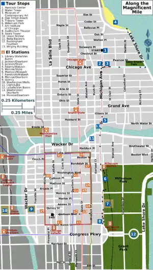 You're walking for most of this itinerary, so wear comfortable shoes, and dress for the weather (and the climate). If it's a warm day in the spring, summer, or early fall, bring a small towel for splashing in the fountains at Millennium Park. This route starts in the Near North, proceeds to the Loop, veers off to the Near West Side, and returns to the Near North. Although the route is very straightforward and easy to follow, you may wish to print out the articles for those districts, if only for a few alternate recommendations and further illustration of what you'll see along the way.