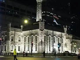 One block south, at Michigan and Chicago, have a look at the old Water Tower. This is a Chicago icon, and the most famous survivor of the 1871 Chicago Fire, along with the less-celebrated Pumping Station on the other side of Michigan Avenue. Street performers may be in the small square behind the Water Tower. (Don't bother tours of the interior, though — it's been scrubbed of any historical traces, and is occasionally used as a gallery space now.) Behind the pumping station on Chicago Ave is a turn-of-the-century firehouse; not quite as old as the other two, but it's still in use, and you'll see members of the Chicago Fire Department (human and canine) relaxing out front if they're not away on a call.