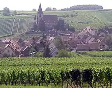 The Alsatian Vineyard Route (Route des Vins d'Alsace) is a mostly rural route in Alsace, France. The route stretches from Marlenheim in the north near Strasbourg, to Thann in the south and east to Mulhouse. The route goes along medieval wine producing villages situated on the slope of the Massif des Vosges.
