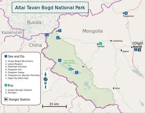 Altai Tavan Bogd National Park (Mongolian: Алтай Таван богд байгалийн цогцолбор газар) is located on the westernmost point of Mongolia in Bayan-Ulgii Province. This vast mountainous park borders China and Russia with views of Kazakhstan from the highest peak in Mongolia.