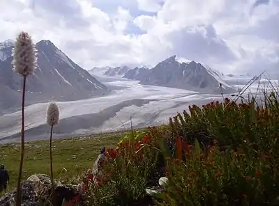 The snow-capped Kuiten Uul mountain, 4374 m (14,201 ft), is the highest of the five peaks of Tavan Bogd Mountains (literally '5 Saints') that gives the park its name. It covers an area of 630,000 ha and is home to three large freshwater lakes and 34 glaciers, plus several waterfalls. The largest, Potanin Glacier, covers 23 km2. Tavan Bogd Mountains are considered sacred to local Kazakhs, Tuvans, and Mongolians. The park stretches from Russia along the Chinese border, following the Altai Mountain Range that divides China, Russia, Mongolia, and Kazakhstan, for over 200 km. Ancient tribes have left many artifacts, using the region for religious ceremonies. Today, tens of thousands of petroglyphs in the park are part of a World Heritage Site. In addition there are numerous Turkic Stone Men and stone burial mounds.