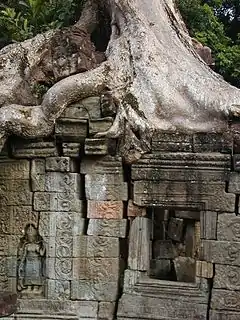 - Ta Prohm. Built during the time of king Jayavarman VII and is best known as the temple where trees have been left intertwined with the stonework, much as it was uncovered from the jungle. It might be considered in a state of disrepair but there is a strange beauty in the marvelous strangler fig trees which provide a stunning display of the embrace between nature and the human handiwork. This is one of the most popular temples after Angkor Wat and the Bayon because of the beautiful combinations of wood and stone. Black and white film photographers especially love this site because of this and most of the stunning postcard shots of Angkor's trees come from here. A few scenes from Angelina Jolie's Tomb Raider were filmed here. While the temple is very popular, most visitors follow a central route and the sides of the complex can be surprisingly quiet. Large sections of the temple are unstable rubble and have been cordoned off, as they are in real danger of collapse. Restoration of Ta Prohm has included removing plants, and some trees. Parts of the temple have been rebuilt, and wooden walkways run through the site, providing date access for visitors, and ruining photos.