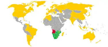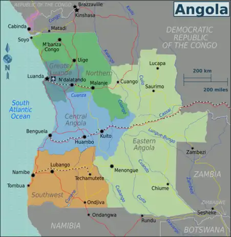 Angola is a country in Central Africa. It shares borders with Namibia, Zambia, and the two Congos.