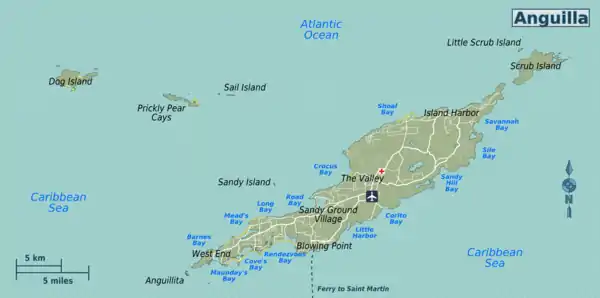 Anguilla is a British Overseas Territory in the Caribbean Sea, a few miles north of Saint Martin.