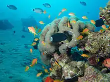 Have a look at an online map south of Aqaba, such as in the Tala Bay article; many dive centers can be found there, and diving is extremely popular. A two-dive single-day package typically costs around 50 JD, but booking multi-dive packages in advance can save a lot. Almost all dives are shore based. A small number of sites are better accessed by boat, though the journey is never more than 45 min and is typically in the 20-min range. Though dive packages tend to be more expensive than nearby Egypt, the quality of operators is much more consistent, and the fact virtually all dives are done as shore dives save both money and time with day-boats. Diving here is also good for beginners, as there are no tides, and currents and swells this far up the gulf of Aqaba are minimal, which also means diving any given site is all but guaranteed, regardless of what the weather is up to.