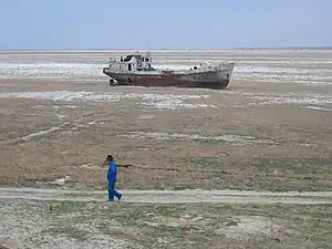 Some time around 1960, the Aral Sea started shrinking. In 1986, with the falling sea level, the former sea divided into two separate parts: the North Aral Sea in Kazakhstan, and the South Aral Sea mainly in Uzbekistan. Thanks to a dyke built in 2005 between the two parts by the Kazakhs, who are more prosperous and less dependent on agricultural irrigation than their southern neighbours, the northern part somewhat stabilized, or even regained some of its lost territory as much as to allow some low-scale commercial fishing, but is still a far cry from its former self. The southern part is yet to receive such a helping hand, and will likely have to do without in the foreseeable future — or perhaps forever, as the Uzbek government, implicitly conceding that the sea will never return, started afforestration of parts of its former bed in the 2010s in an effort to subdue pesticide-laden dust storms. So the southern sea is far, far away from its former banks and, unless in an exceptional year with much precipitation, still receding.