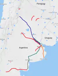 There are no long-distance international services to Argentina, only a short-distance train from Encarnación (Paraguay) to Posadas (though even that is not operating as of June 2022). Coming from Bolivia, the border towns of Villazón and Yacuiba can be reached by train. A connection between Chile and Argentina is under construction.