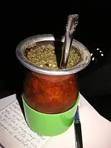 Yerba mate (pronounced in two syllables, 'MAH-teh') is a traditional Argentine herbal drink, prepared in a hollowed-out gourd which is passed around in a social setting and drunk through a metal straw. Although usually drunk hot, mate can also be served cold, usually known as "tereré"; the version that is preferred in Paraguay and Mato Grosso, Brazil. Mate contains less caffeine than coffee, but contains other vitamins and minerals that give it a stimulating effect, particularly to those who are not used to it. It is naturally rather bitter, so it's not uncommon to add sugar, though it's polite to ask before adding sugar to it. The drinking of mate with friends is an important social ritual in Argentina. The informal tea ceremony is led by a "cebador" or server and people arrange themselves in a "rueda" or wheel.