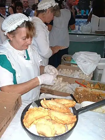Empanadas are stuffed dough pockets, mostly in the shape of a half moon, and with a characteristical pattern at the edge where it is closed. It's the most famous dish of the northwestern part of the country, and probably from the Salta province, which would explain why they are called salteñas in neighboring Bolivia.