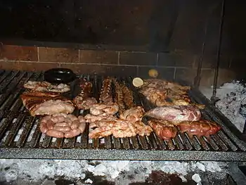 In the "normal" version of asado, the meat parts are prepared on a grill, and always over the glowing charcoals, never over the flame. In the traditional version, asado con cuero, the animal is cut up in a few big pieces and set above a fire or heap of glowing charcoals. The biggest versions of asado con cuero entails the whole animal being roasted in this way, though this is common only at really big events such as folklore and gaucho festivals, and this preparation reportedly makes the meat particularly delicious.