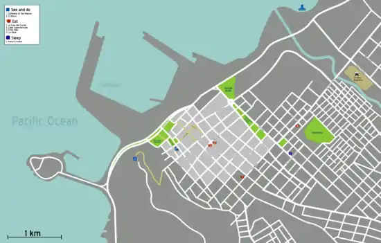 - 🌍 Morro de Arica. A steep hill that overlooks Arica from 139 m above sea level. The views from el Morro are superb. You can follow the work being done in the harbour closely or gaze at the mountains gradually turning into the altiplano in the east. The hill looks like a giant sand dune from a distance but it is in fact made of solid rock. The paved footpath visible from anywhere in town starts at the south end of Calle Colón. Allow 10 minutes for walking up, and enough time for philosophic discussions on top. There is a war museum on the hill for those into uniforms and cannons from the 19th century. Beware of the dishonest Coca Cola vending machines; bring water and snacks from town. The hill, together with the archaeological Museo de Sitio Colón 10 museum next to it and the mouth of Camarones River some 100 km south of Arica make up a world heritage site related to the pre-Columbian Chinchorro culture and their mummification practices.