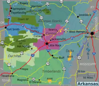| Ouachitas West central part of the state that is home to the Ouachita mountains (including the state's highest peak, Mt. Magazine) and Ouachita National Forest |